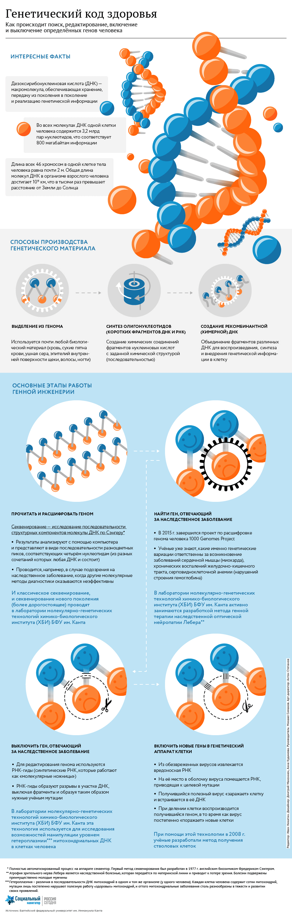 Новая инфографика проекта "Социальный навигатор” МИА "Россия сегодня" рассказывает о современных достижениях генной инженерии в борьбе с наследственными заболеваниями человека.
